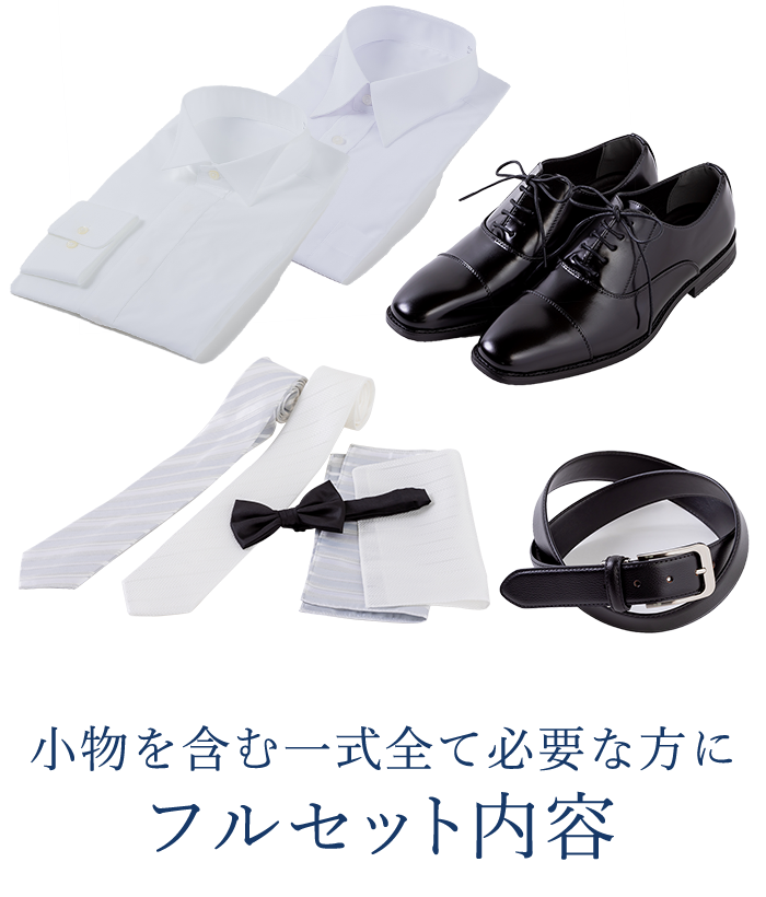 セット内容・・・ジャケット、パンツ、ネクタイ、シャツ、シューズ、ベルト